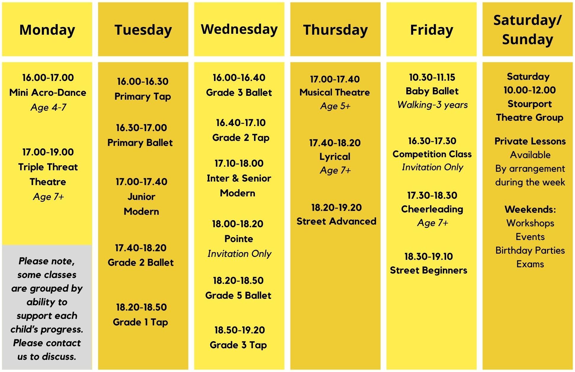 Explore our Kidderminster timetable and find the right performing arts class for every age, from tiny tots to teens and adults.